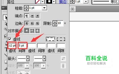 继续在描边面板里设置虚线和虚线间距的值,如图所示: