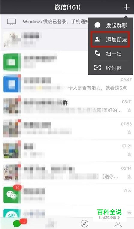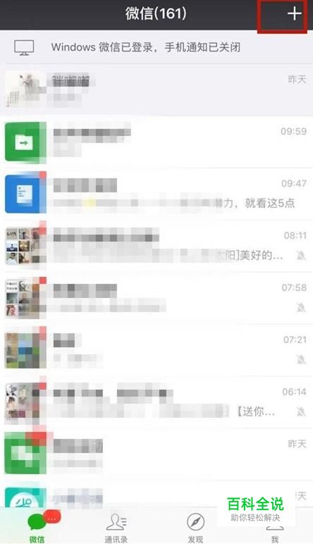 首先点击微信右上方的加号键,如下图所示。