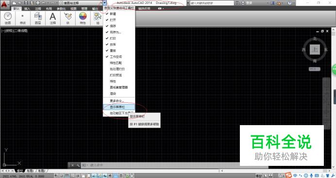 启动AutoCAD 2014辅助设计软件,如图所示。点击自定义快速访问工具栏右侧向下箭头,弹出下拉列表选择"显示菜单栏"项。