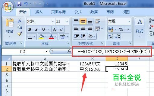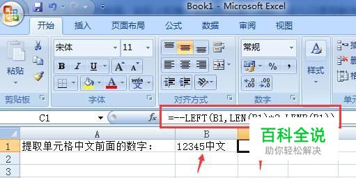 首先,如图在C1单元格中输入公式=--LEFT(B1,LEN(B1)*2-LENB(B1)),获取B1中的数字12345。公式中“--”用来强制转换为数字格式,LEN获取格中文本长度,不管中文数字一律算为1个字符长度,而中文是2个字符长度,所以乘以2,再减掉实际长度LENB(B1),得到数字长度。LEFT为从左边开始获取。