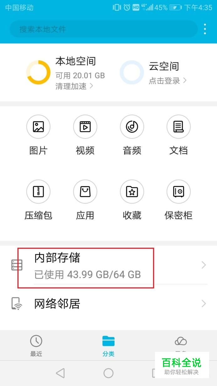 打开手机文件管理,点击内部存储,如图。