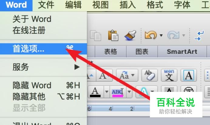 要取消首字母自动大写,我们点击菜单栏上的‘Word’--‘首选项’。