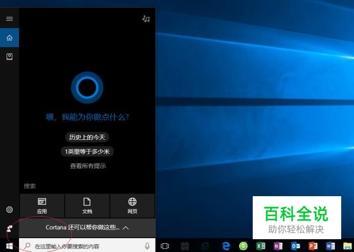 点击任务栏搜索框,用于打开"Cortana"智能语音助理。