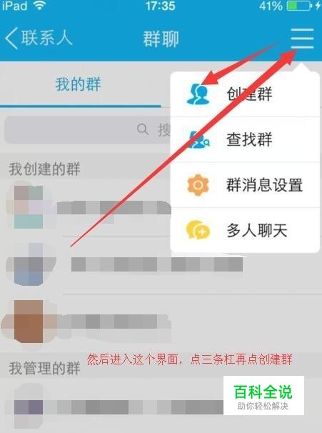 进入后右上方有三道横线,点一下,下面有个创建群,点一下进入设置分类界面。