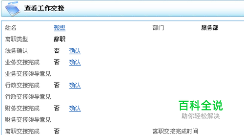 工作交接 业务交接:由拟离职员工的直接上级主管经理负责把关,完成诸如客户资料移交、在跟业务移交、技术工作承接安排等事务后,主管经理负责在系统里 确认业务交接完成 行政交接:由行政后勤等部门工作人员负责把关,确保拟离职员工之前借用的各项物品已归还、承担的相应责任已完结,才可在系统里 确认行政交接完成 财务交接:由财务部门工作人员负责把关,确保拟离职员工结清各项个人预支款/未结个人税费、代收的业务款和持有的票据上缴等,之后才可在系统里 确认财务交接完成 法务确认:由法务部门/委托律师或相关负责人把关,核实拟离职员工与公司之间在劳动合同关系、财务关系、岗位责任奖惩关系、债权债务关系、对外业务关系等方面的权利义务不存在问题后,才可在系统里进行 法务确认