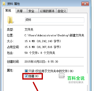 进入属性中,在常规窗口中选择“隐藏”,然后确定。