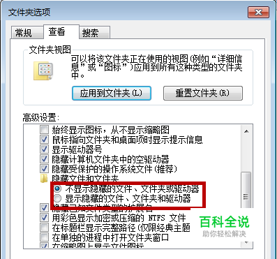 在隐藏文件和文件夹中,是不显示隐藏文件的,如果想要看到被隐藏的文件,点击下面的“显示隐藏文件、文件夹和驱动器”。