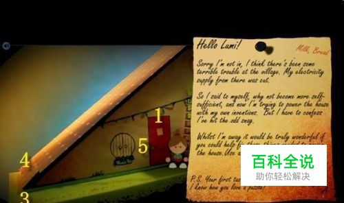点击门上的告示(1)和注意纸上边缘的涂鸦(2)。退出,继续走向屋顶尽头(3),然后点击的太阳能电池板(4)有微弱的,绿色的轮廓)。完成后,点击门把手(5)。