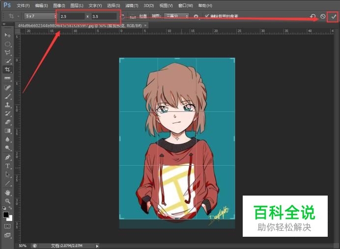 在上面的属性栏输入“2.5”和“3.5”两个数据,把裁剪框调整到适合位置,然后点击菜单栏右侧的“勾勾”按钮。这样的话,一寸照片基本制作完成。