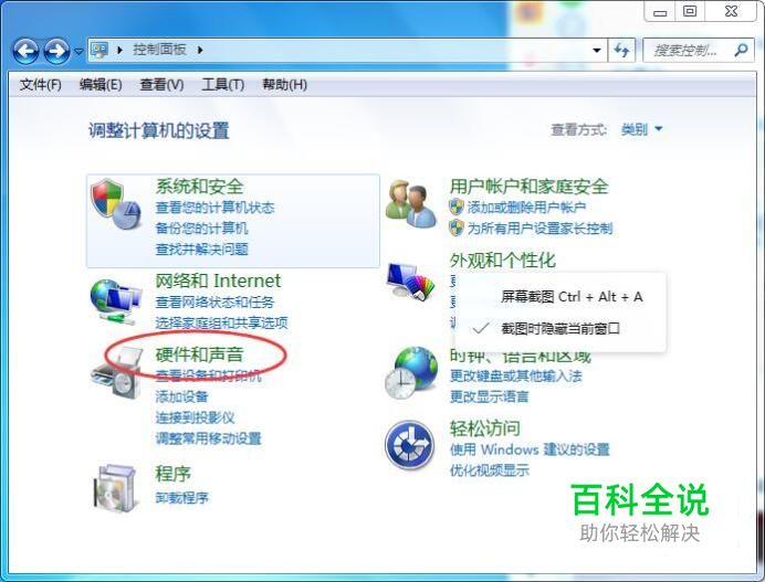 硬件和声音 打开控制面板,然后点击【硬件和声音】,如下图所示: