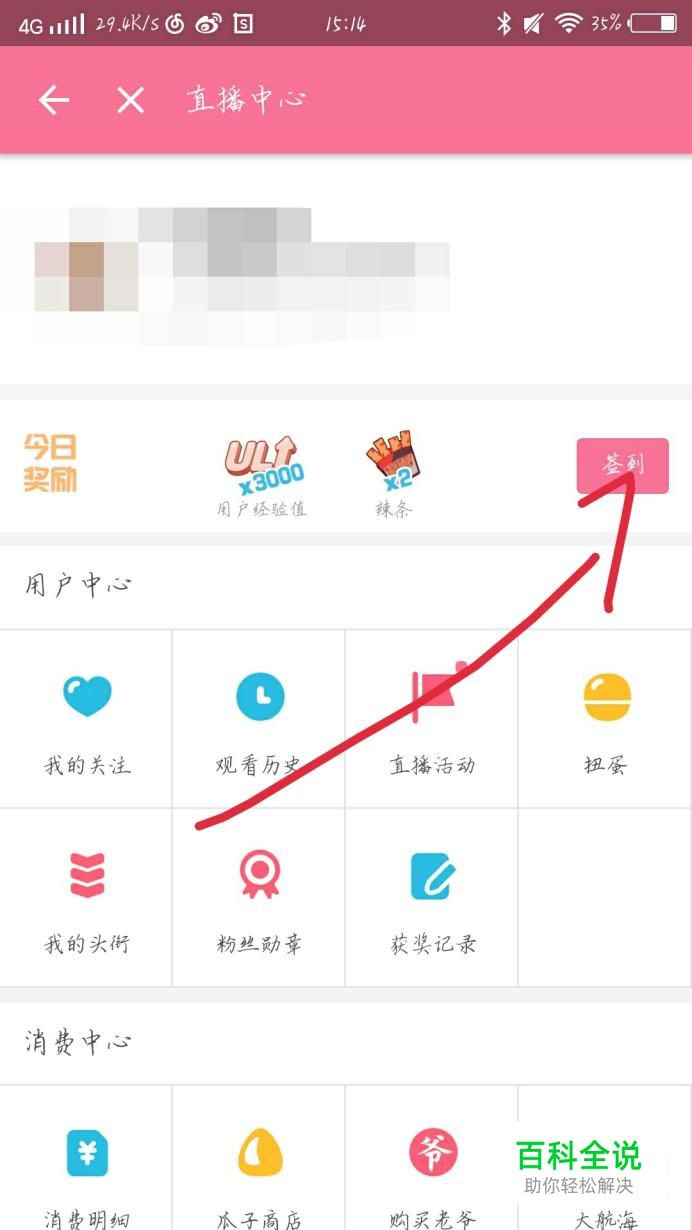 点击“签到”这个选项,如图1箭头所示。这样你就完成签到啦,你可以增加你的经验值。