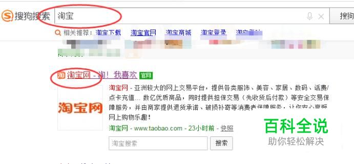 淘宝 在浏览器搜索【淘宝】,点击具有官网标志的链接,如下图所示: