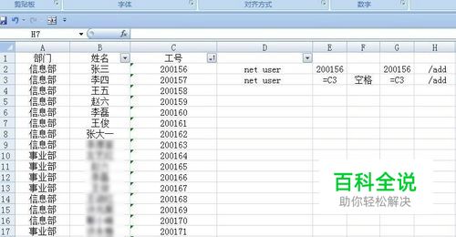 在excel表格中分别输入net user 200156 200156 /add 如图中所示输入,记得不要忘记空格。然后拉直最后或者双击填充控点