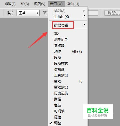 打开ps之后我们找到窗口里的扩展功能选项,没如图所示: