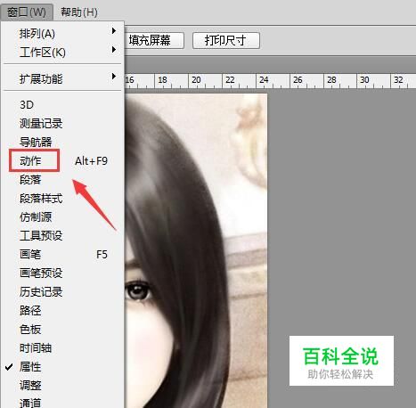 将图片打开之后在菜单里找到窗口,点击窗口在其下拉菜单里找到动作选项,如图所示: