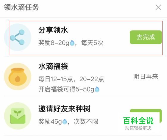 分享领水滴。这是很基本的操作,也是很多人最容易实现浇水的方法,只要分享给好友,就能获得8到20的水滴,非常方便。