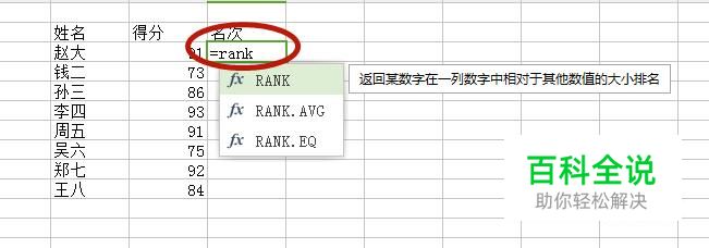 进入Excel表格,选择排名那一列第一行,输入“=rank”,选择自动弹出的第一个函数。