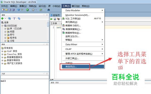 首先打开PLSQLDeveloper软件,点击顶部的工具菜单,然后选择下面的首选项,如下图所示