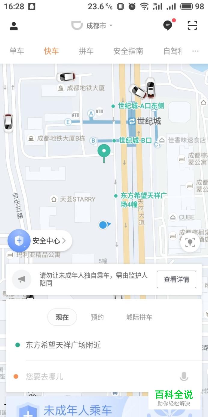 进入滴滴打车界面,在上方选择“快车”,然后在下方输入目的地。