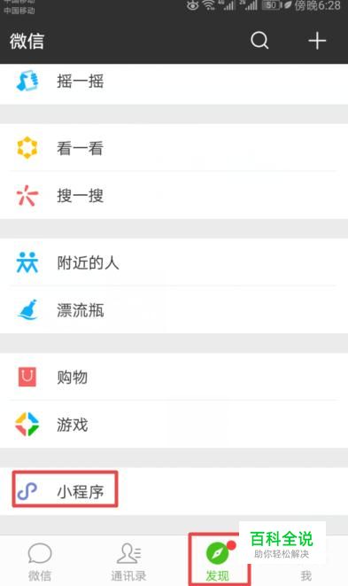 首先,我们打开我们的微信,然后我们点击发现,之后点击小程序;