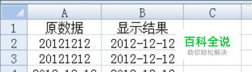 A2单元格日期格式是20121212,要修改成正规格式2012-12-12 B2单元格可输入公式:=LEFT(A2,4)&-MID(A2,5,2)&-RIGHT(A2,2) 或者:=MID(A2,1,4)&-MID(A2,5,2)&-MID(A2,7,2) 都可以实现