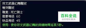 大雕文: 符文武器幻舞雕文:使你符文武器幻舞的持续时间延长5秒。 疫病雕文:你的瘟疫同化现在能使首要目标身上的疾病持续时间和次要疾病效果以最大持续时间重新计算。 死亡打击雕文:使你的每1点符能可提高死亡打击1%伤害(最高可提升25%伤害)。此效果并不会消耗你的符能。