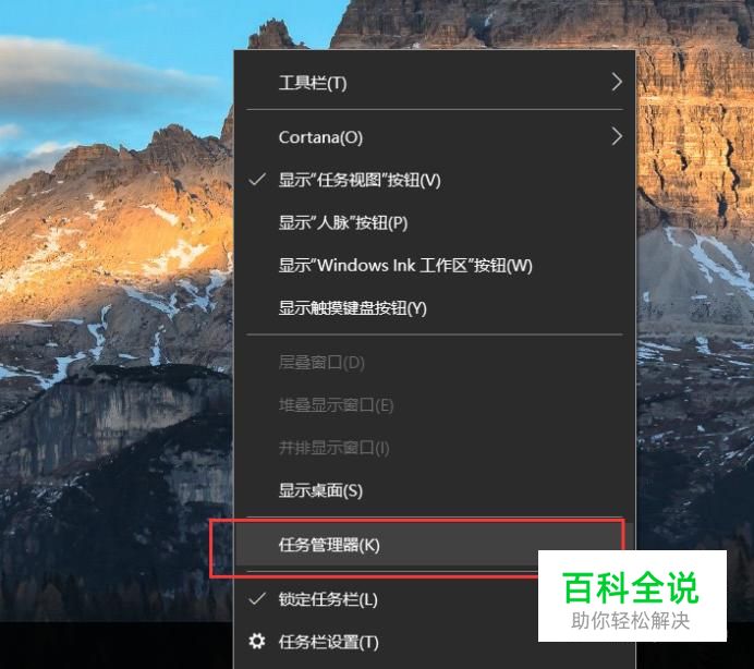 首先,在操作系统桌面任务栏上击右键,选择“任务管理器”菜单选项并打开。