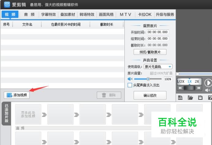 打开爱剪辑软件后,点击“添加视频”按钮,先上传一个视频素材。