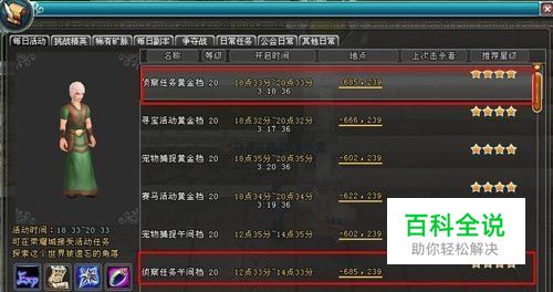 侦查任务 开启时间:12:33-14:3318:33-20:33 可获奖励:经验值、荣耀之城传送卷轴、快速传送石、双倍经验石 在伊米尔大陆上,隐藏着诸多不为人知的通道与秘密。冒险者通过向NPC询问路径、侦查相关信息便可以获得不菲的奖励。一边欣赏大陆美景、一边完成大陆探索,每天2此的探索足以让你知晓大陆上所有的秘密。