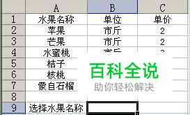 比如下图,A列是水果名称,现在,我们要做的就是,B9单元格,让其成为选择框。