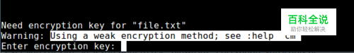 Vim 有个 -x 选项,这个选项能让你在创建文件时用它来加密。一旦你运行下面的 vim 命令,你会被提示输入一个密钥: $ vim -x file.txt 警告:正在使用弱加密方法;参见 :help 'cm' 输入加密密钥:******* 再次输入相同密钥:******* 如果第二次输入的密钥无误,你就能可以修改此文件了。
