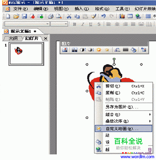 首先打开金山WPS演示,用绘图工具绘出图案(或插入剪贴图片),选中图片,右击鼠标,选择“自定义动画”如图: