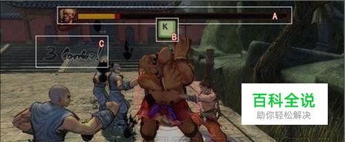 如图所示: 战斗界面: 敌方主要角色血槽;2:战斗时所触发QTE提示,需要玩家尽快使用该提示按键破除对方格挡状态;3:玩家连续攻击成功数,每一关的最高数字将统计入过关分数结算;4:玩家所操控角色头像;5:玩家所携带生命道具提示,表示该玩家拥有复活一次的机会。如没有携带则不出现该提示;6:玩家所携带佣兵种类提示,上面数字则表示招唤他所需要花费的金额。如没有携带则不出现该提示;7:玩家每次动作所获得的能量提示。能量一旦满槽则玩家可以获得一格气力;8:玩家所拥有的气槽数,通过积攒能量获得。每格气槽都允许玩家释放一次技能大招;9:玩家血槽。