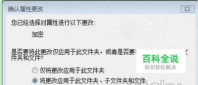 4、在返回的“常规”选项页中点击“确定”,系统将会根据加密文件与文件夹的不同而询问进一步的设置,如加密文件夹时询问是否应用到其下的子文件夹及文件;而加密文件时则会询问是否加密该文件的父文件夹等,根据具体需要选择相应的选项;