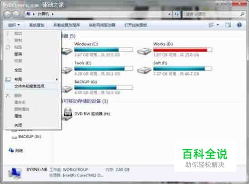 点击资源管理器左上方的“组织”按钮,点击“文件夹和搜索选项”;