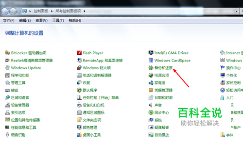 首先在开始菜单中打开控制面板,打开控制面板之后,在控制面板的众多选择项中打开备份和还原选项。如图所示。