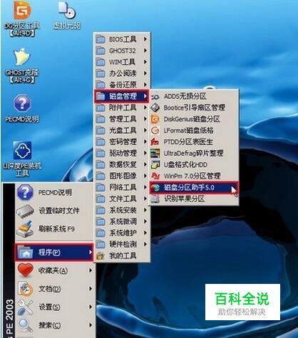 进入pe系统后,依次点开“开始-程序-磁盘管理-磁盘分区助手5.0”,如下图所示: