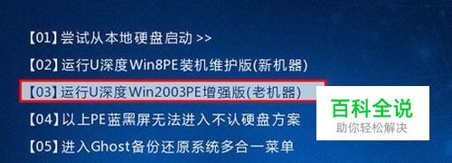 将制作好的u深度u盘启动盘插入电脑接口,开机按快捷键进入主菜单界面,选择“【03】运行U深度Win2003PE增强版(老机器)”,如下图所示: