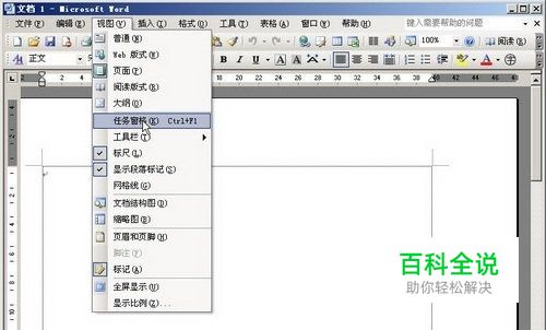 默认情况下,第一次启动Word2003时打开的是“开始工作”任务窗格。如果启动Word2003时没有出现任务窗格,可以依次单击“视图”→“任务窗格”菜单命令将其打开,如图2009102204所示。 图2009102204 打开Word2003“任务窗格”