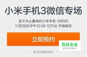 最近小米手机的购买渠道,开始从官网转向到天猫商城,现在也加入了微信平台。近日微博,微信上都会看到11月28日,微信预约小米手机的消息。下面小编就为大家来介绍下微信怎么预约小米3。 如果是在微信中关注过小米手机微信号的朋友,相信都会收到这样一条关于小米微信卖场的推送消息。点击此消息进入小米手机微信预约界面,如图所示。小米3微信专场 注:如果你还未关注的话,可以自行关注小米手机。 随后在微信预约界面中,点击“预约免费送礼”按钮。 接下来会看到可以在微信上通过1分钱完成预约,并且还会看到通过微信预约的用户会有一些优惠礼品。点击“立即支付”按钮继续。 注:微信支付需要先绑定自己的银行卡。 这里输入自己在微信支付中设置的密码,点击“支付”继续。 最后可以看到支付成功信息,表示已经预约成功,点击“完成”返回。 当预约成功以后,会收到一个小米提供的微信免费表情包,点击即可进入下载页面。 随后点击下载即可在微信中使用了。 最后等待11月28号中午12点,在微信上抢购吧。 以上就是微信预约小米3的步骤及注意事项。相信有了在官网抢购的朋友,对于在微信平台上预约,流程上应该不会难道米粉们。不过在这里小编还要提醒下大家要记得先把微信支付绑定自己的银行卡。