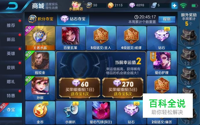 《王者荣耀》不是有一个钻石夺宝的活动吗?这个钻石夺宝就是通过钻石抽奖,然后积累幸运值,幸运值越高或者刚好达到100,就可以得到王者水晶。