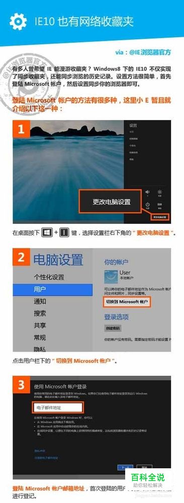 IE浏览器今天发布了关于Win8 下 IE浏览器实现漫游收藏夹的教程。这样一来就不必每次都在新电脑上来回导入导出网址和历史记录。只需在Windows8中登陆您的Microsoft账户就能实时同步IE10的收藏夹和历史记录。不仅如此,Win8 的同步功能还能支持同步你的桌面背景、网络及Windows设置等等…