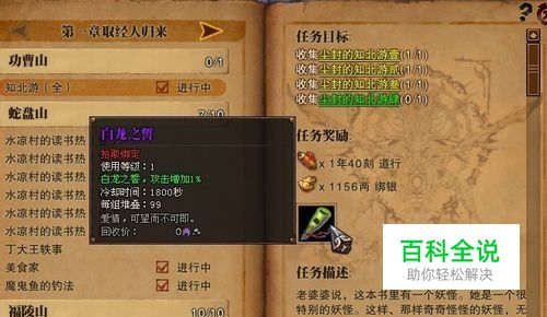 然后看地图任务标示去接取隐藏外传丁大王轶事,此任务奖励知北游三。 这个任务需要需要玩家收集封魂之戒,这里不要着急,跟着主线任务一直做下去就会去打丁大王拿到封魂之戒。 如果实在找不到封魂之戒请看括号内攻略(去水凉村战鼓进入副本,进入副本后什么事也不要做等待第一个BOSS把老头子打到半血,之后会出来一个NPC,向NPC购买任务酒(建议多买因为超过等级后掉落很低)去逆龙坑使用购买的任务酒方可进入幻境获得封混之戒(掉落很低请耐心刷如果你还想做这个任务的话))。 接着继续跟着正传任务走,下面要玩家通过水凉村战鼓回到过去,依然是清完怪物后出现知北游二。