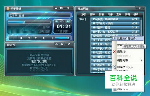 这次解决的是中文歌曲播放乱码的问题.最简单的方法就是用千千静听这个软件.如下图所示,CTRL A选中播放列表内所有的歌曲,然后右键,选中"批量文件属性".