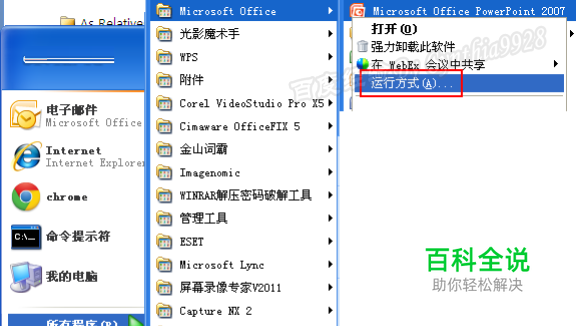 如果应用程序都打不开,则以其它帐号打开。按住shift右击PPT应用程序图标,选择“运行方式”:
