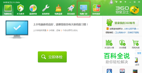 安装360安全卫士。点击“电脑门诊”,如图:
