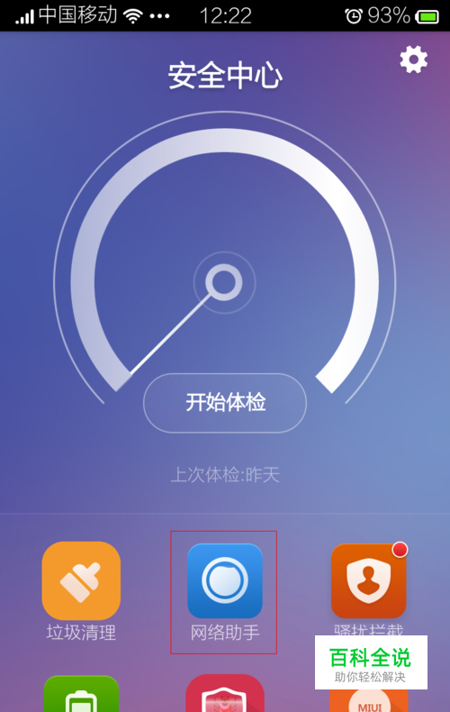 找到打开小米手机的“安全中心”,可以看到里面有一个“网络助手”图标,点击进入;