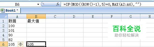 在b6中输入函数公式,=IF(MOD((ROW()-1),5)=0,MAX(A2:A6),""),其中mod是用来求余数的,max是用来求一定范围内最大值的,if是条件判断,当条件满足 相隔5个数时,求5个数里面的最大值