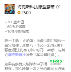 海克斯科技原型腰带-01 总价格:2500 合成价格:650 出售价格:1750 物品描述 +300生命 +60法强 +10%冷却缩减 唯一主动-火焰弹:向前冲刺并释放一圈火焰弹,造成75-150(+25%X法术强度)魔法伤害。(冷却时间:40秒,与其它海克斯科技装备共享冷却时间)。 如果有多发火焰弹命中了相同的英雄或野怪,那么除第一法之外的每发火焰弹会造成10%伤害。(这个冲刺效果无法穿越地形。)