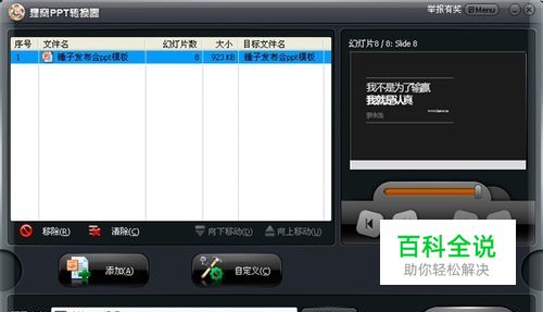 选定好输出视频格式后,点击确定返回主界面,在界面的最下方有几个参数可以设置,像输出音视频的质量,、输出文件的路径等等,往上一点,点击一下【自定义】按钮进入自定义设置,这里面有着设置幻灯片换片的时间、消除ppt原来的声音、添加ppt背景音乐、给ppt添加水印等功能。